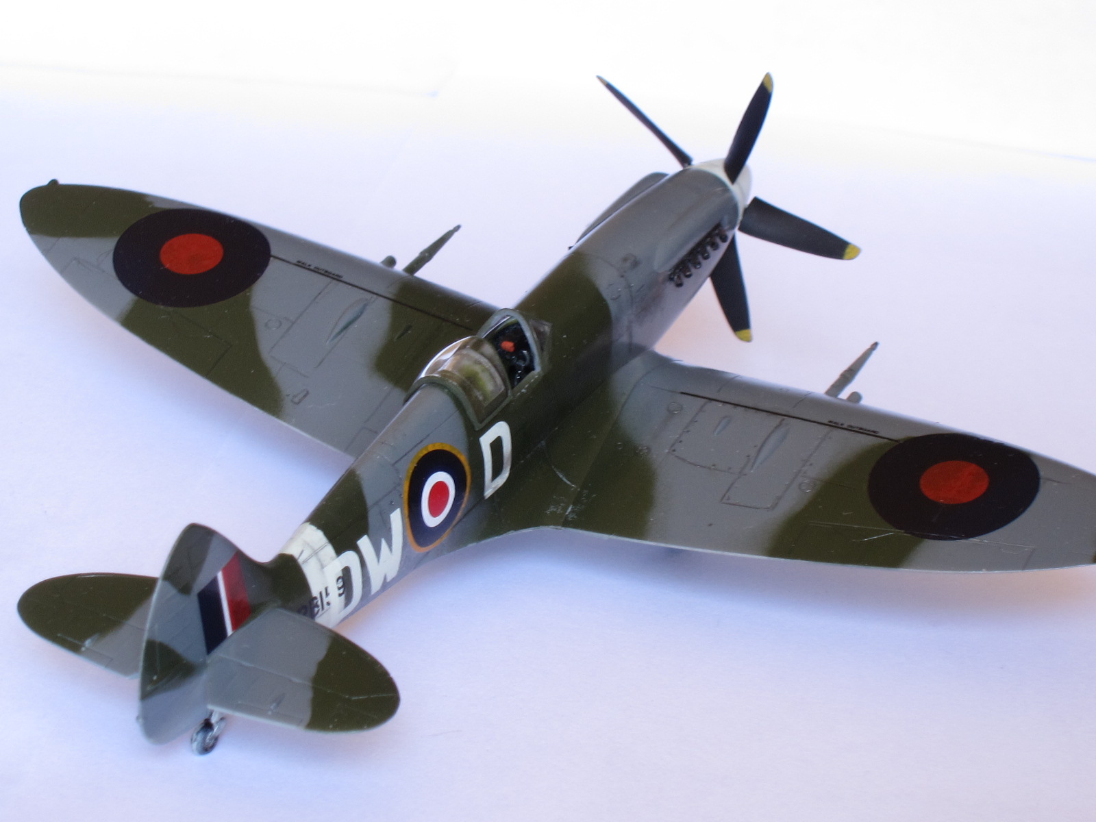 One special note to say about this plane, Mk.XIV was the first member of this extraordinary family in use the powerful Griffon engine (specially designed for Spitfire with two superchargers), representing a big step ahead in performance with respect the Mk.IX variant.This is the Academy kit in 1/72 scale, one of the better kits of this important company. A real pleasure to build, needs no putty, perfect alignment, excellent level of detailing...if you want, may thin the filters edges (I did not). Painting by hand the propeller blades was a mistake, a light pass with airbrush would had been better (thinner than hand brushing).