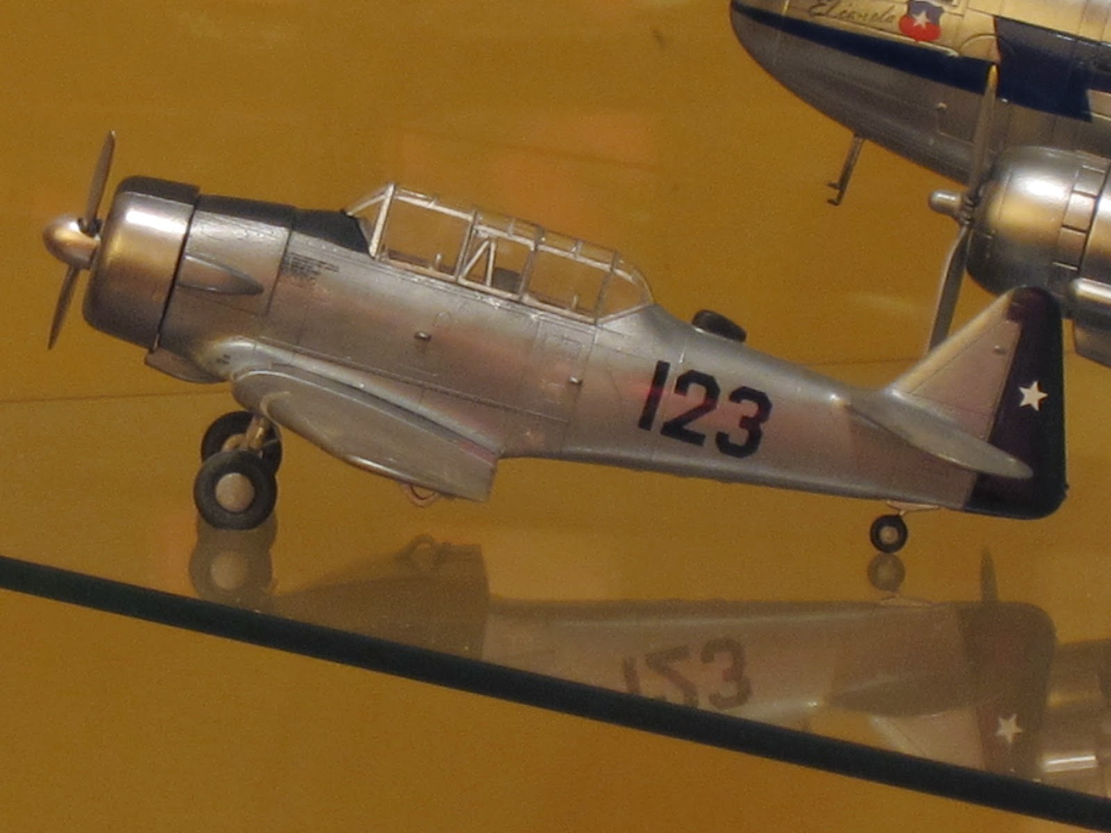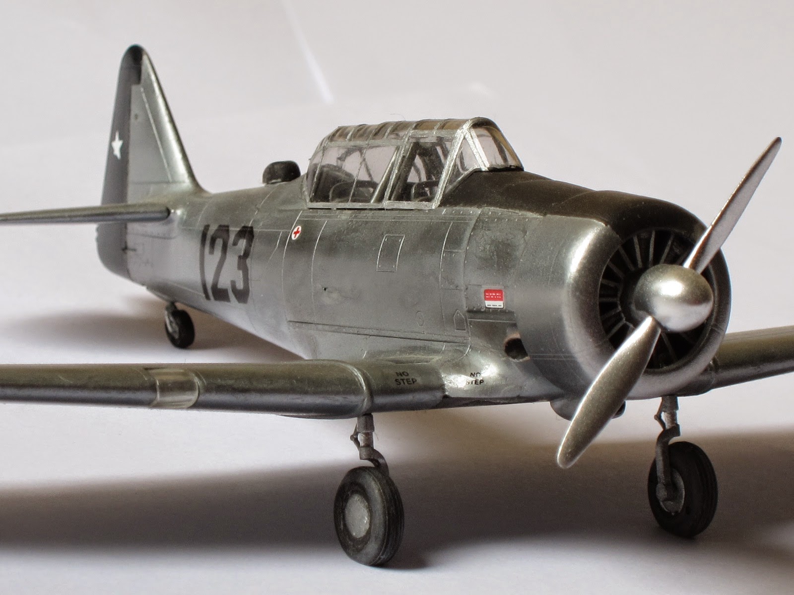 This is the Academy kit in 1/72th scale. Easy to build. FACH T-6 wore a lot of schemes, some very attractive indeed. But I choose the boring natural metal finish of the early service times because I needed to practice and test some Model Master buffing paint shades.