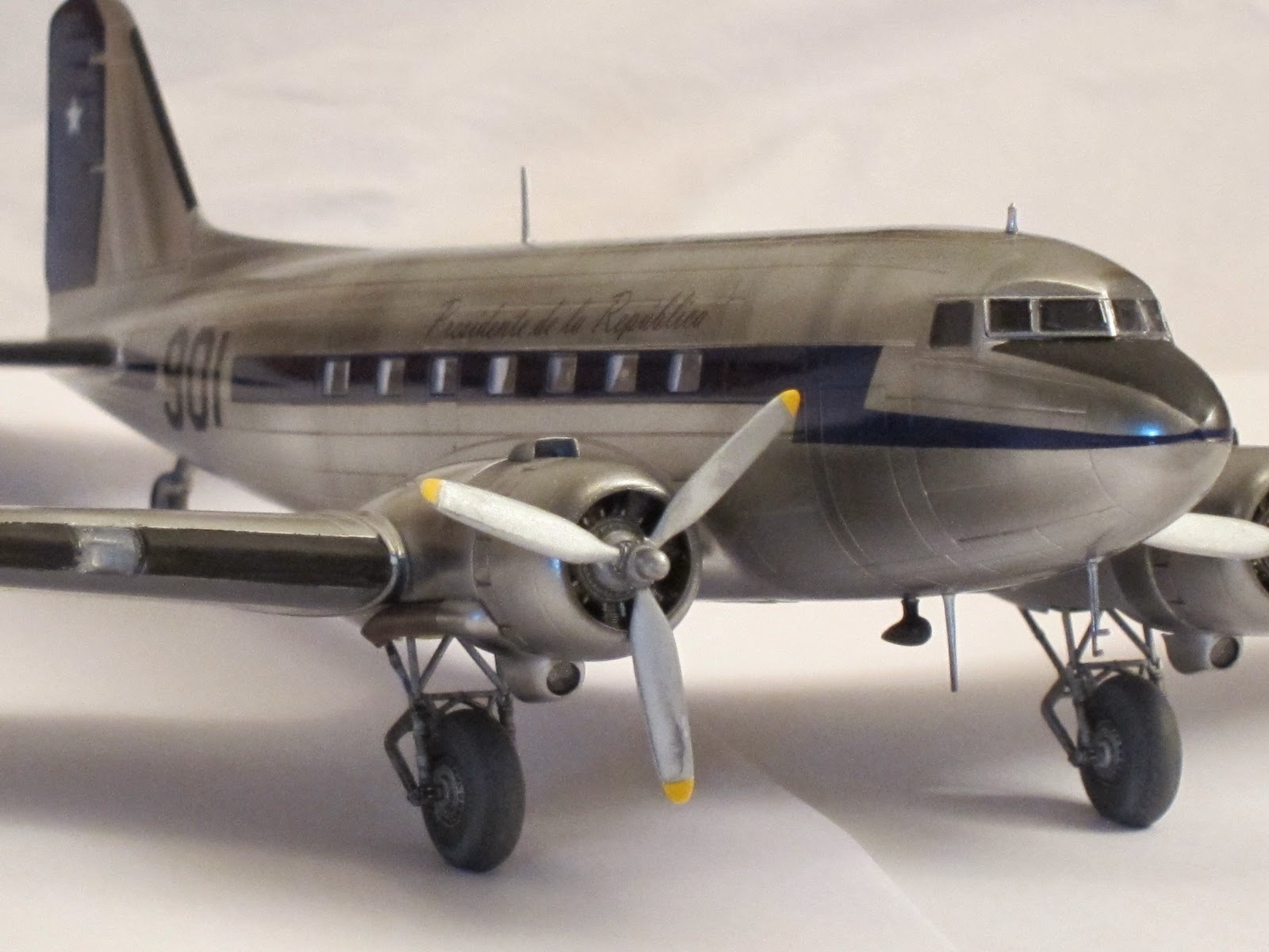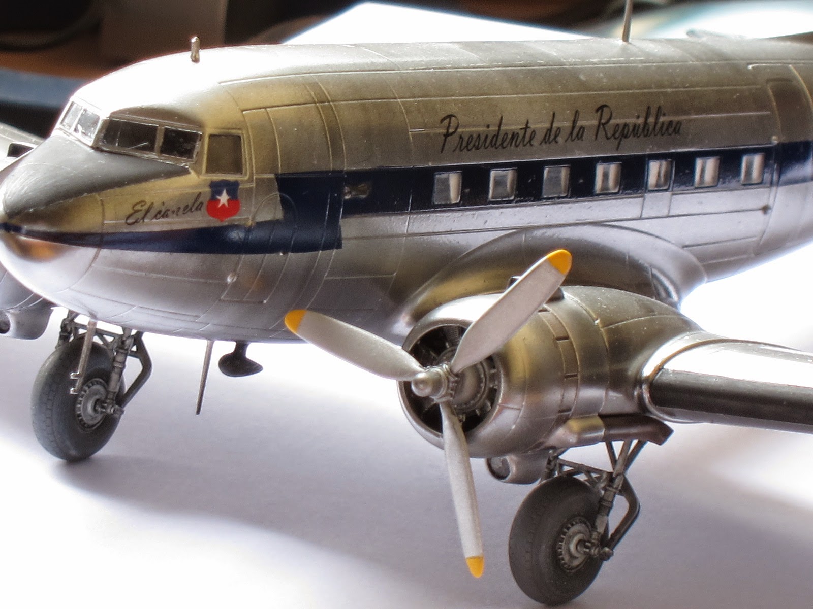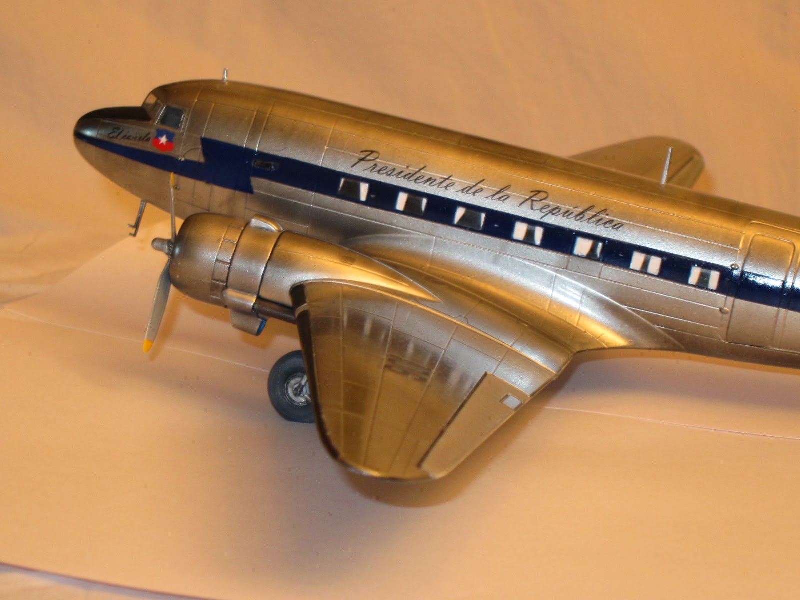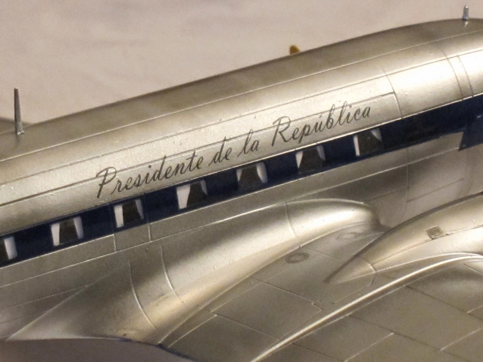 She was the first presidential aircraft in Chile (1947) and got that name after the standard interior color in civilian planes by Douglas in that era. There are few pictures at present times, but is known that the motto was scripted besides a small chilean flag on port side under pilot window. On the fuselage, both sides, over the windows was the legend 'Presidente de la República'.The very first scheme she dressed was overall natural metal finish. Later, at the end of forties or beginning the fifties Chilean Air Force unified painting schemes of all transport planes with white paint on the upper side of fuselage and a dark blue ribbon all across the windows.