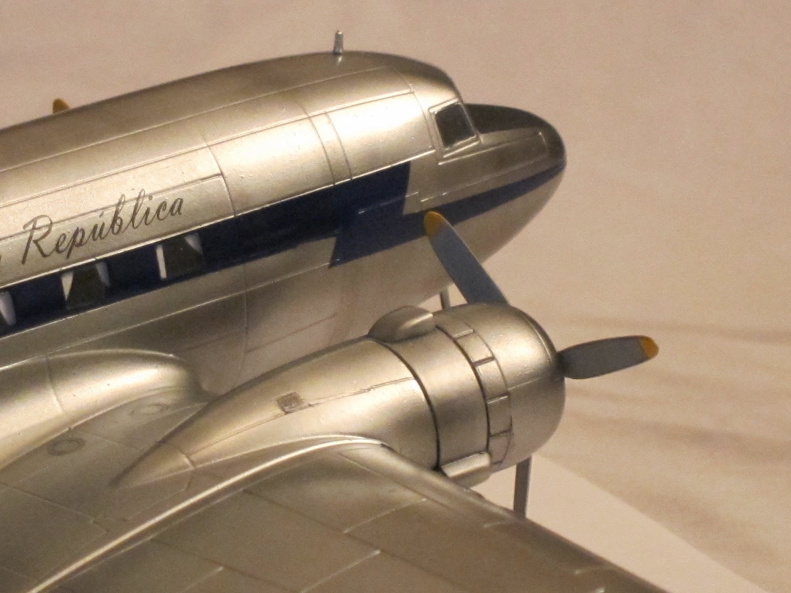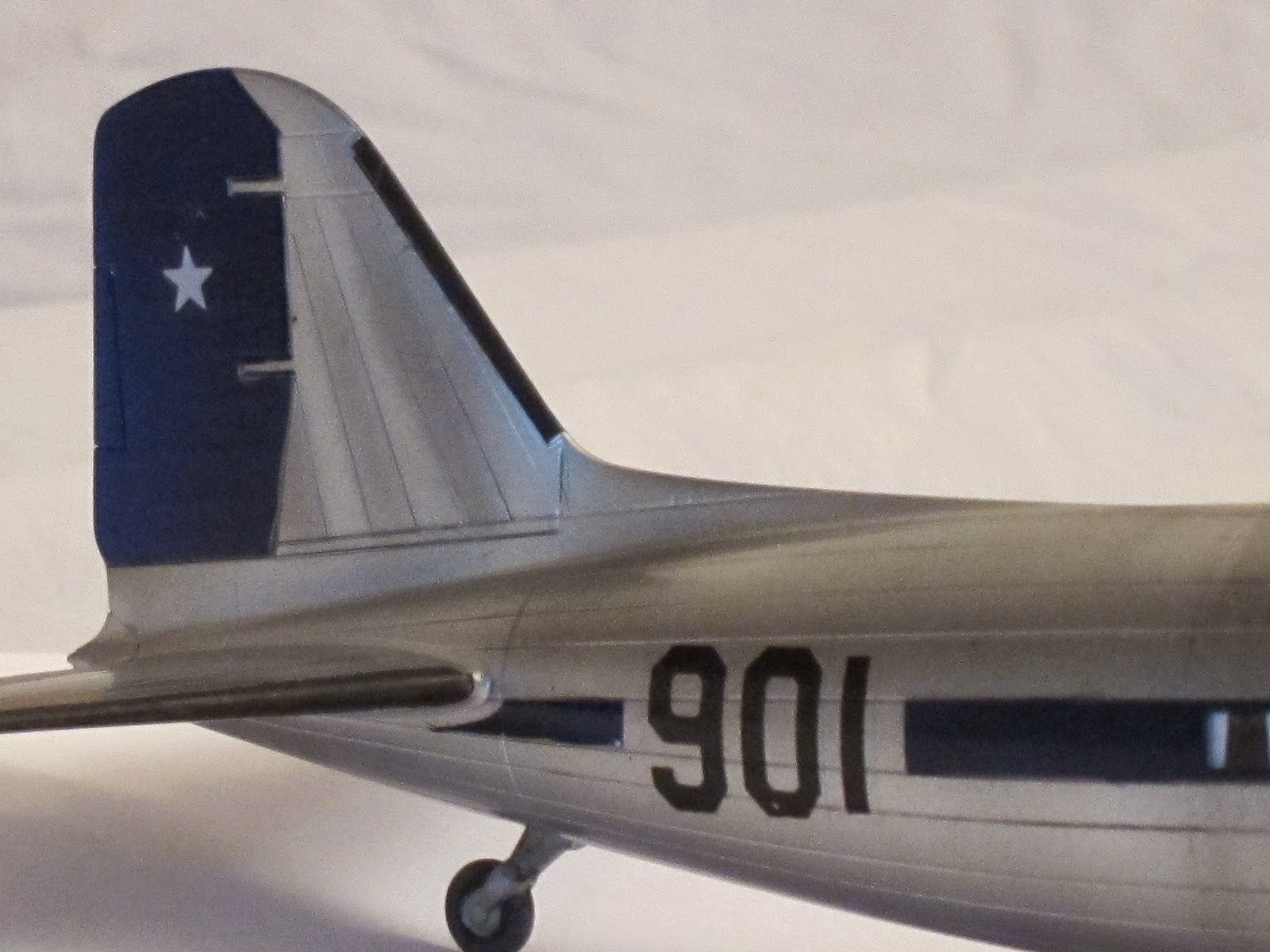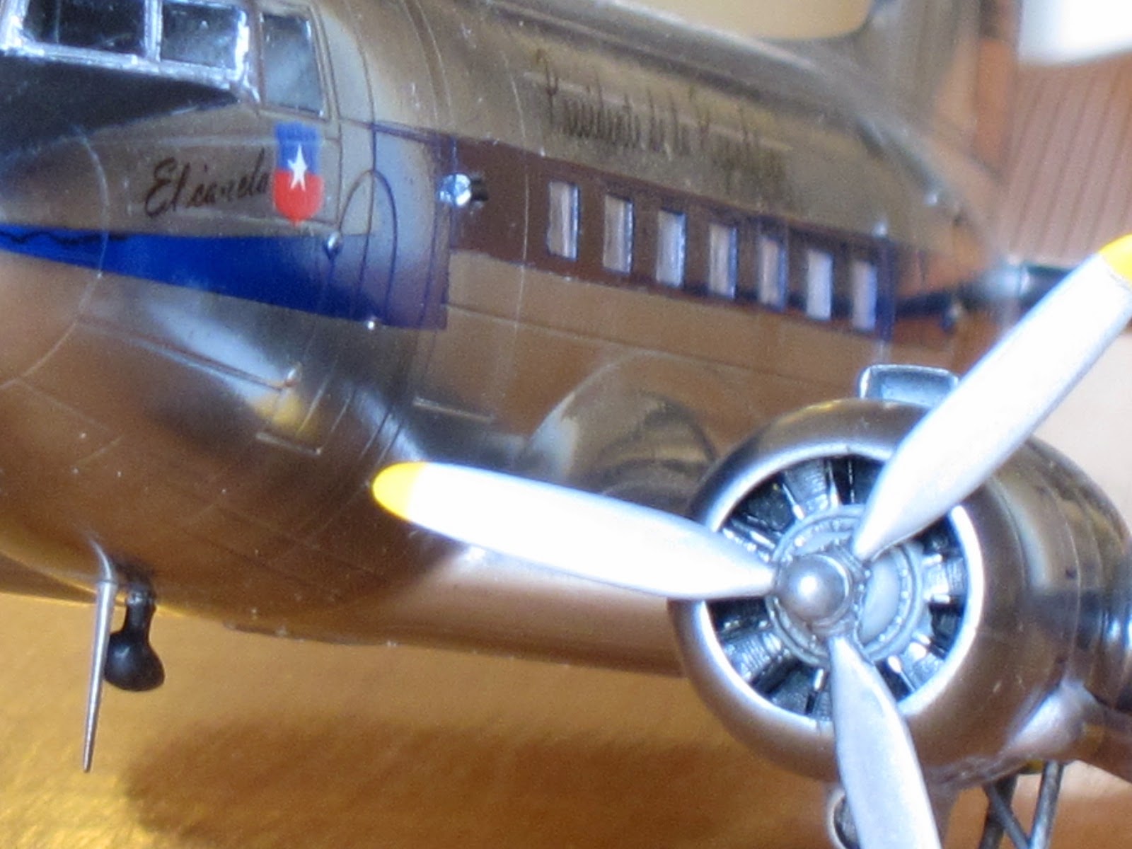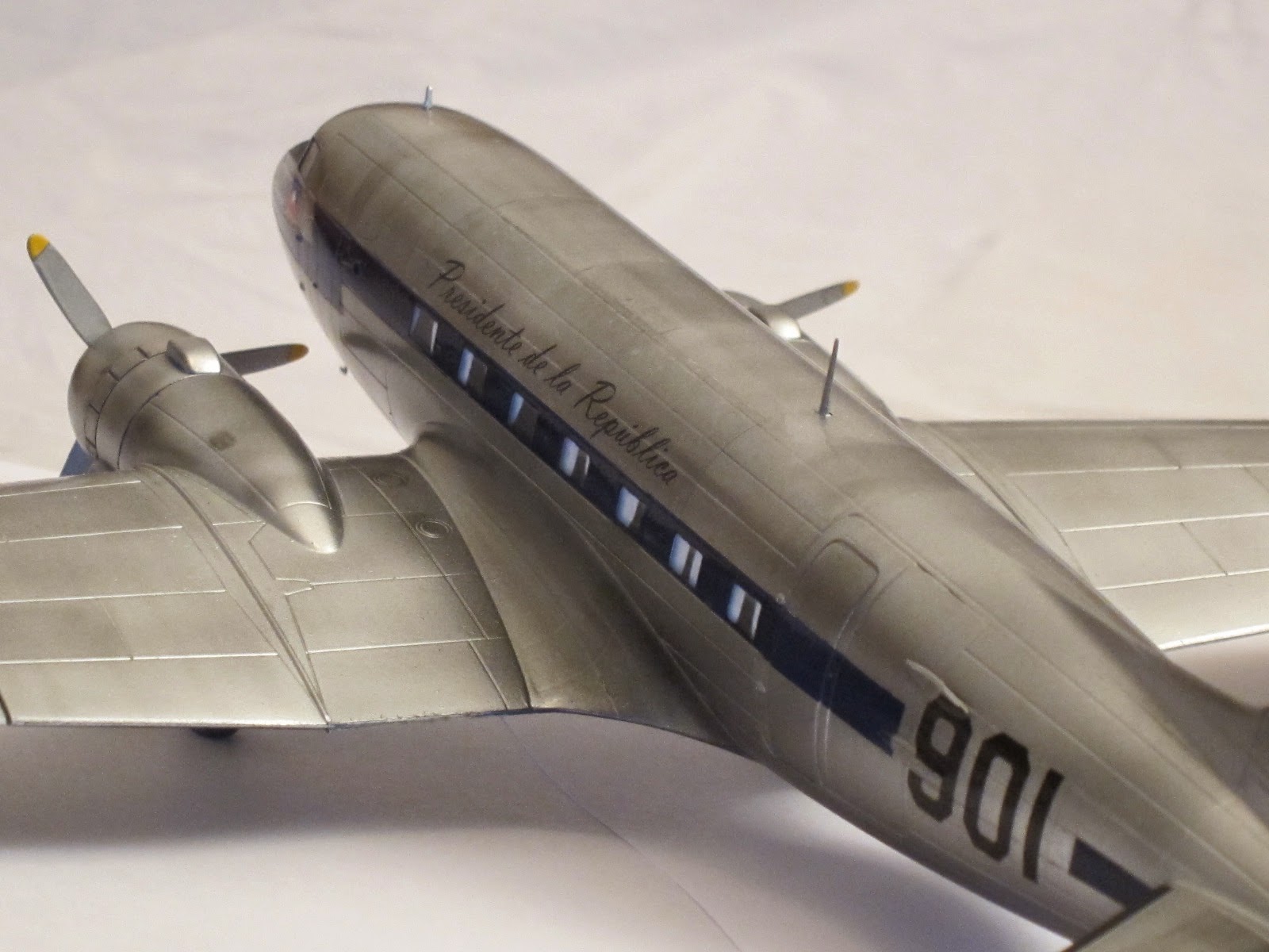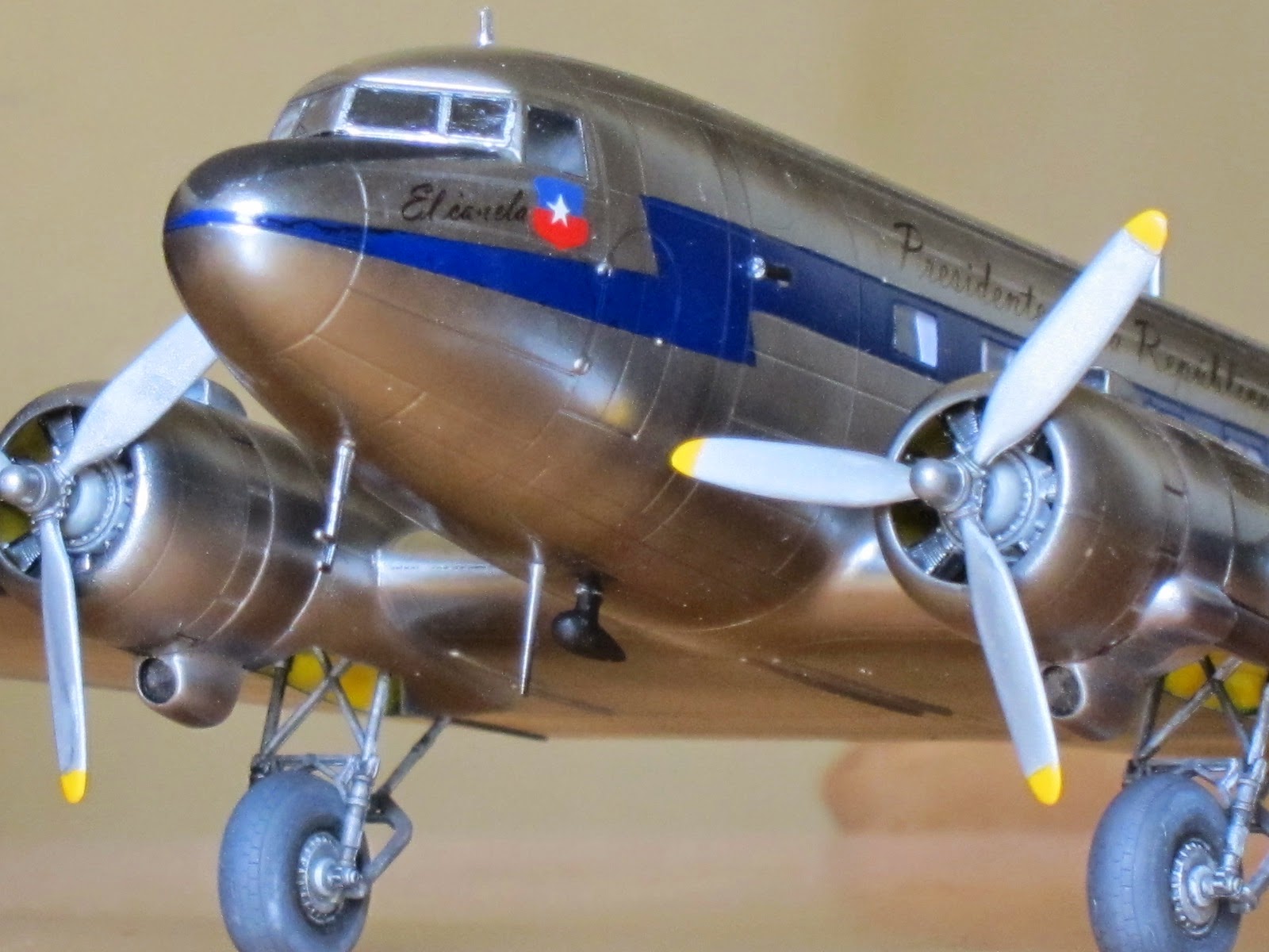 She was the first presidential aircraft in Chile (1947) and got that name after the standard interior color in civilian planes by Douglas in that era. There are few pictures at present times, but is known that the motto was scripted besides a small chilean flag on port side under pilot window. On the fuselage, both sides, over the windows was the legend 'Presidente de la República'.The very first scheme she dressed was overall natural metal finish. Later, at the end of forties or beginning the fifties Chilean Air Force unified painting schemes of all transport planes with white paint on the upper side of fuselage and a dark blue ribbon all across the windows.