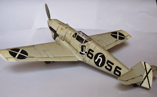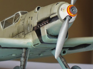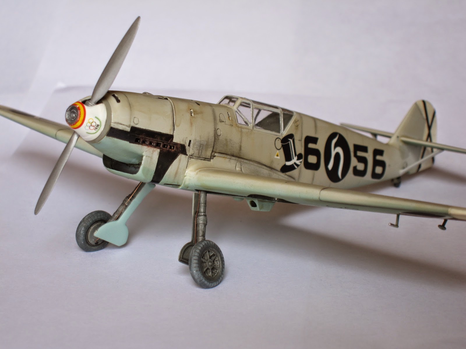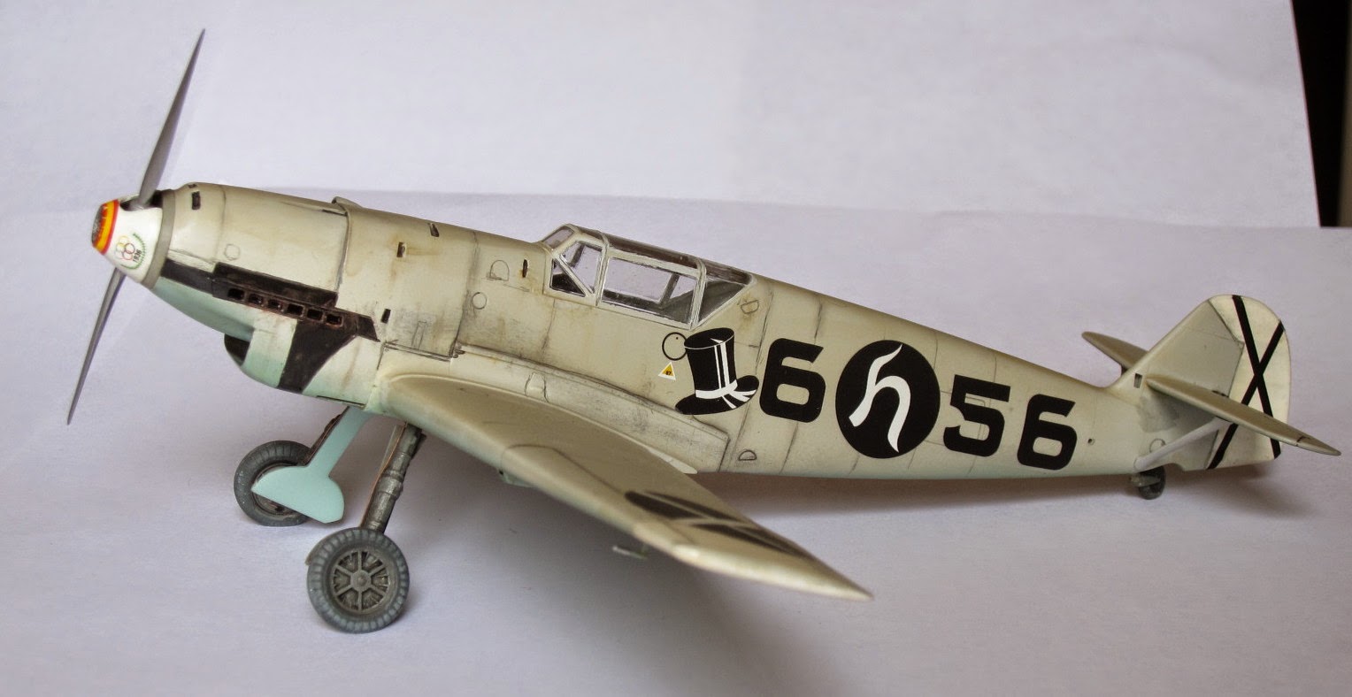If one wants to do the D variant of the Messer (Bayerische flugzeugwerke at that time), it's a must to do an Spanish Civil War model. This is the case...my model represents the mount of Major Gottahrd Handrick who was famous because won the pentathlon in the Berlin Olympics Games of 1936 and he put the olympic rings on the spinner of the 6-56 coded machine of the J./88 of the famous Legión Condor. The "zylinder hut" was the emblem of the second staffel of jagdgeschwader 88. Important to note, this specific aircraft had no antenna.
