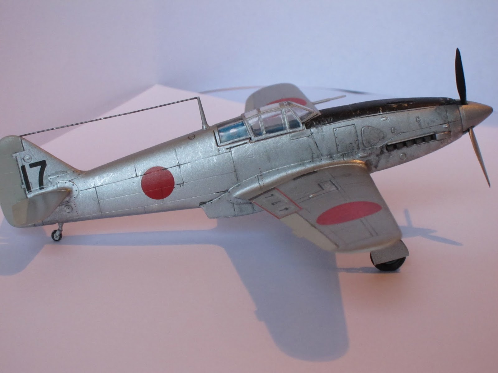 This is the Fine Molds 1/72 kit...may be the most expensive kit even bought in my entirely life. An absolute non sense...I bought it at beginning of nineties just because I could do it ...the box contains a typical Hasegawa 1/72 kit, i.e. bright and brittle plastic with a few recessed lines, but with two set of fuselage halves...the usual set for Ki-61 and the other imitating a stressed material...not bad really, and a little set of metal parts: propellers, undercarriage, and an huge spinner absolutely out of proportions...but the soft metal permits to clean the excess with easy. At that time, the addition of metal parts to plastic kits was in its infancy and Fine Molds asserts its products as it was an enormous contribution.The building process was like with any Hasegawa kit...smooth and easy. I had the temptation to paint the model with highly polished natural metal finish, but I thought Japan industry was, in the final stages of the war, in the worst conditions to test new machines, so, I'd decide for opaque and dirty NMF.