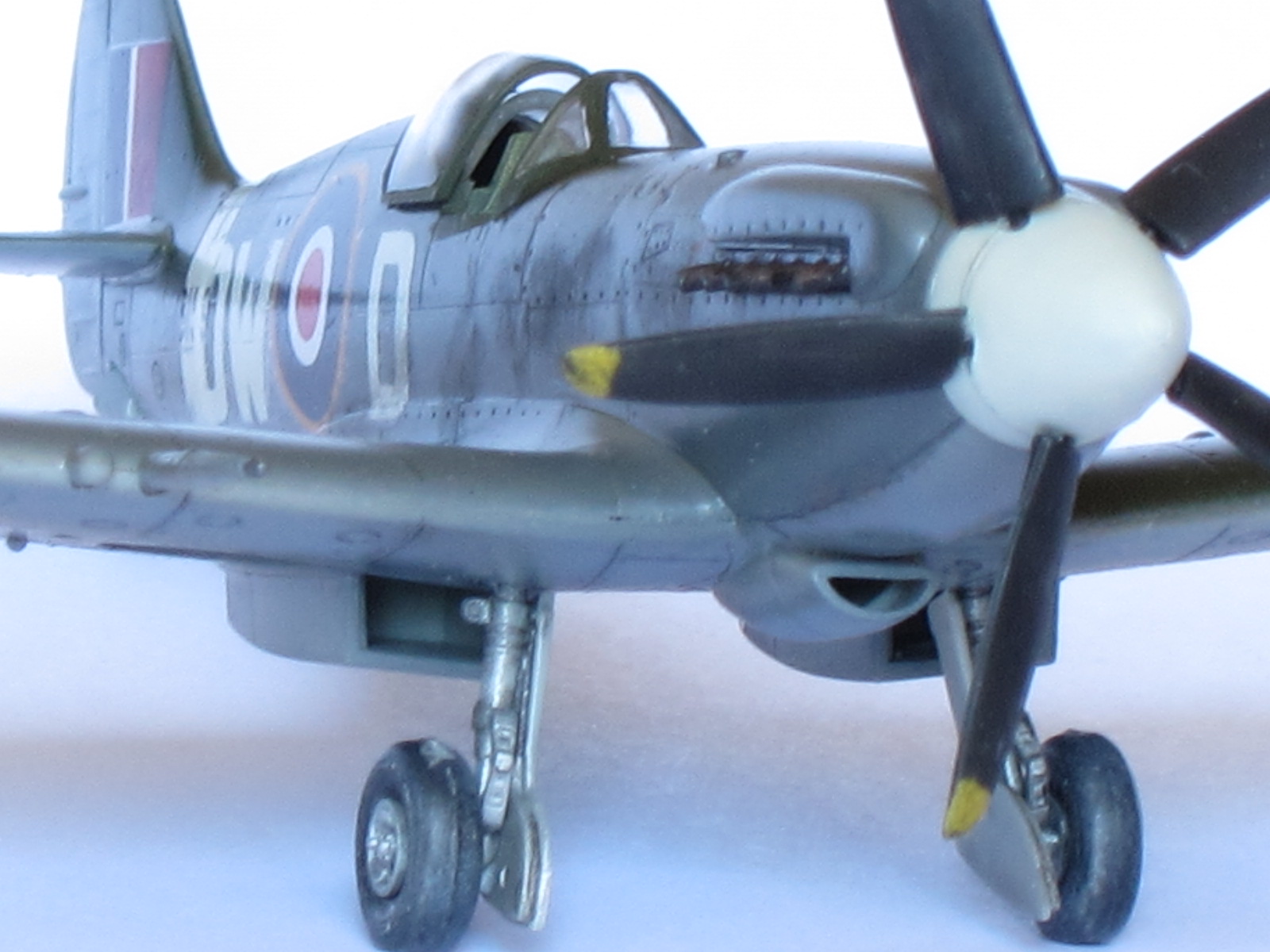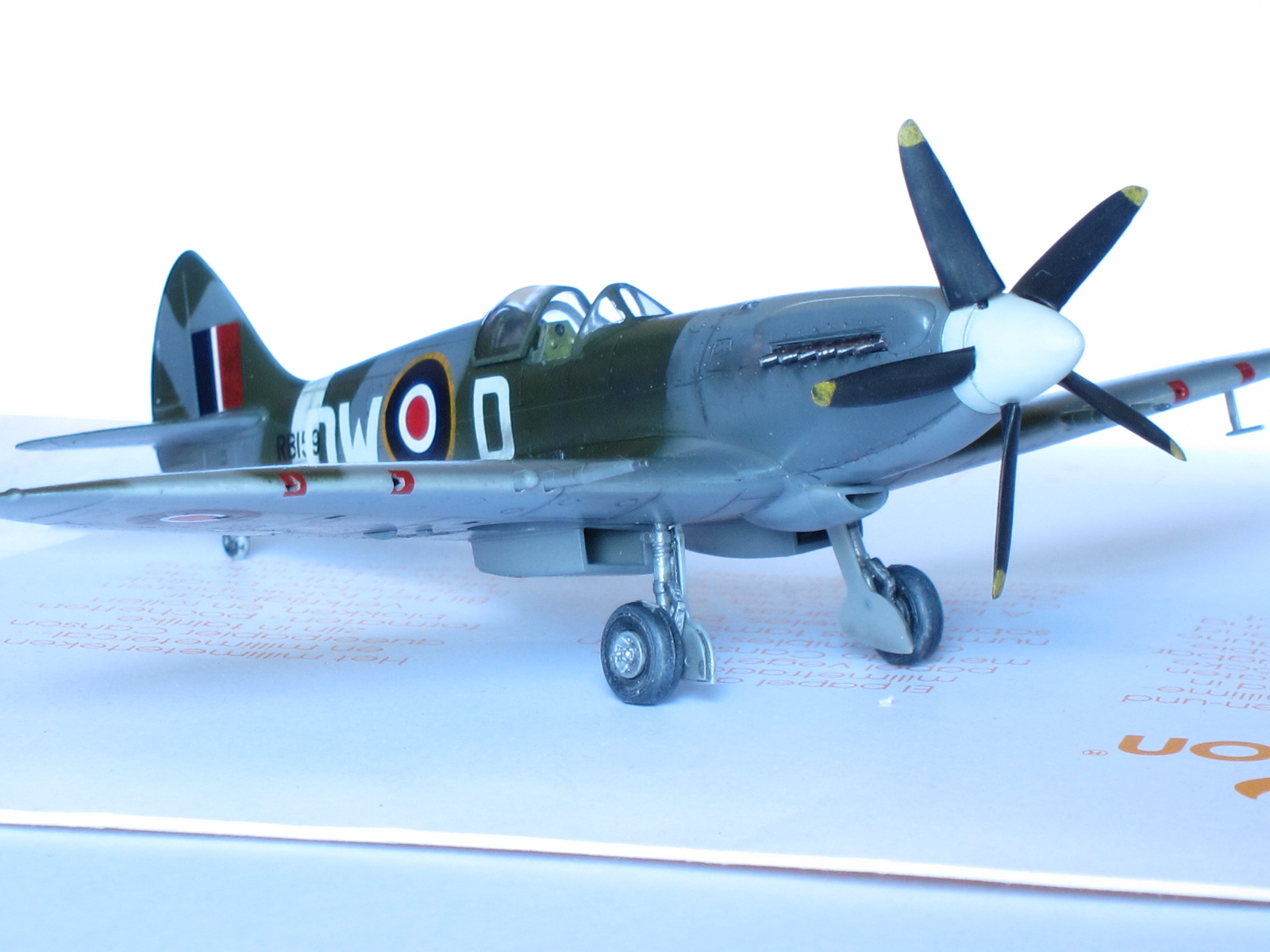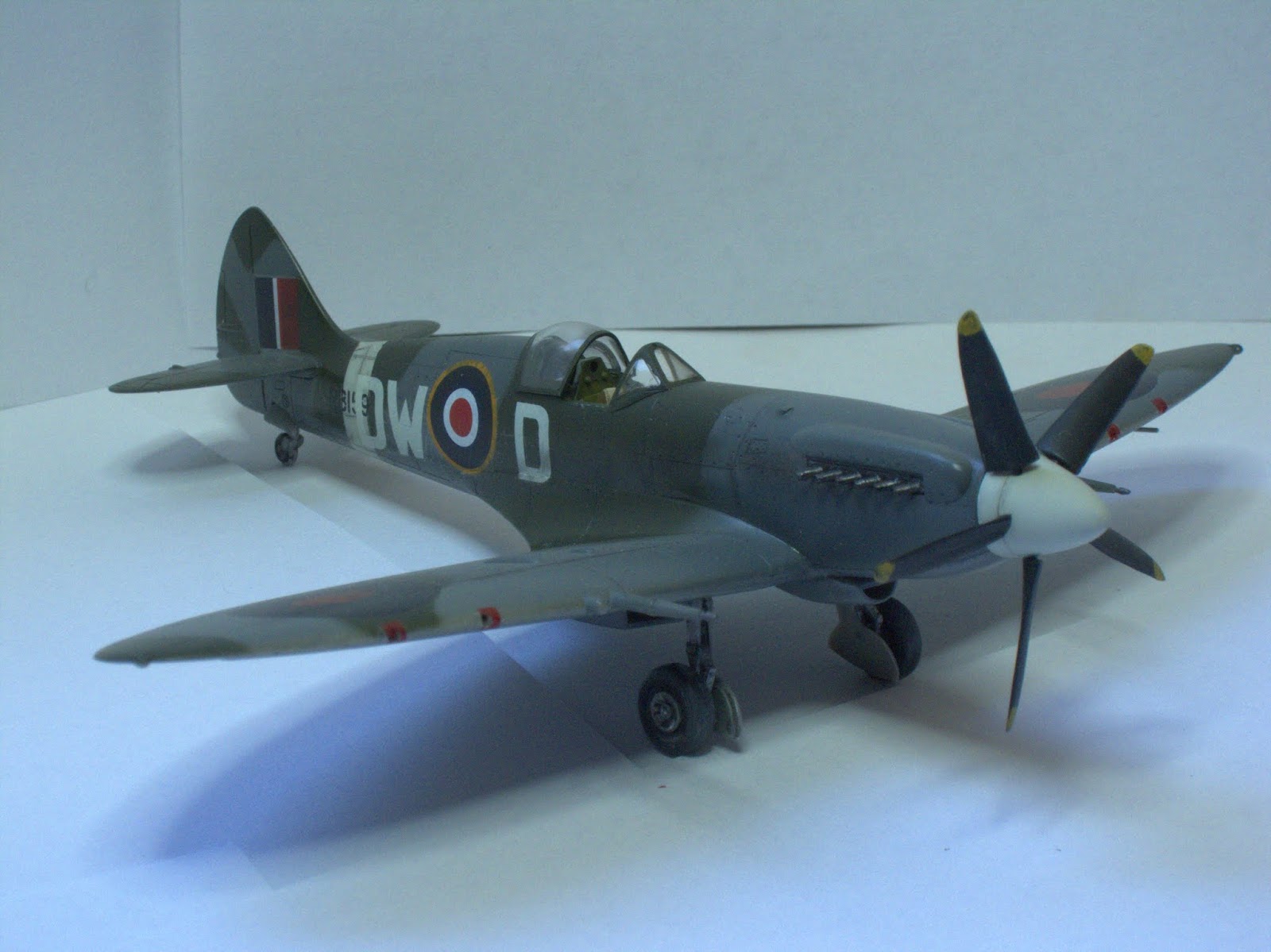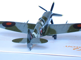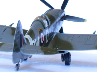 One special note to say about this plane, Mk.XIV was the first member of this extraordinary family in use the powerful Griffon engine (specially designed for Spitfire with two superchargers), representing a big step ahead in performance with respect the Mk.IX variant.This is the Academy kit in 1/72 scale, one of the better kits of this important company. A real pleasure to build, needs no putty, perfect alignment, excellent level of detailing...if you want, may thin the filters edges (I did not). Painting by hand the propeller blades was a mistake, a light pass with airbrush would had been better (thinner than hand brushing).
